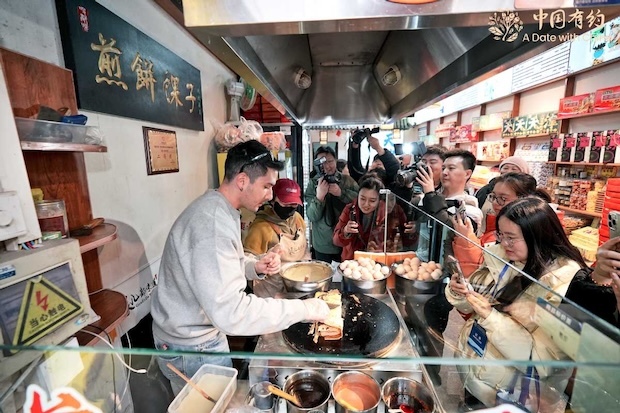 On Ancient Culture Street, Italian blogger Andrea stepped up to the griddle and tried his hand at making jianbing guozi (Chinese pancake wrap), joking, "You may have seen Italians make pizza, but this is probably the first time you've seen an Italian make jianbing guozi." The finished product was met with enthusiastic praise from the group.