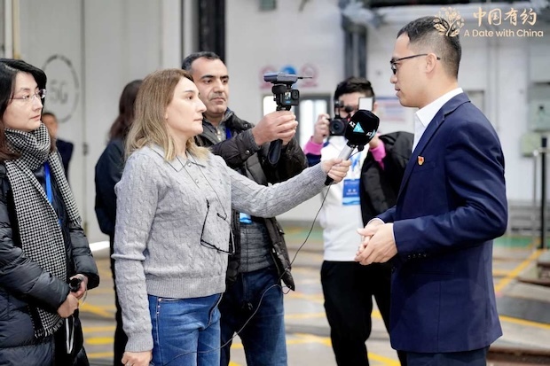 Reporters from Azerbaijan AZ TV interview staff member of Tianjin Metro Line 1 Rail Transit Operation Co Ltd, in Tianjin, North China, on Dec 15, 2025. [Photo/chinadaily.com.cn]